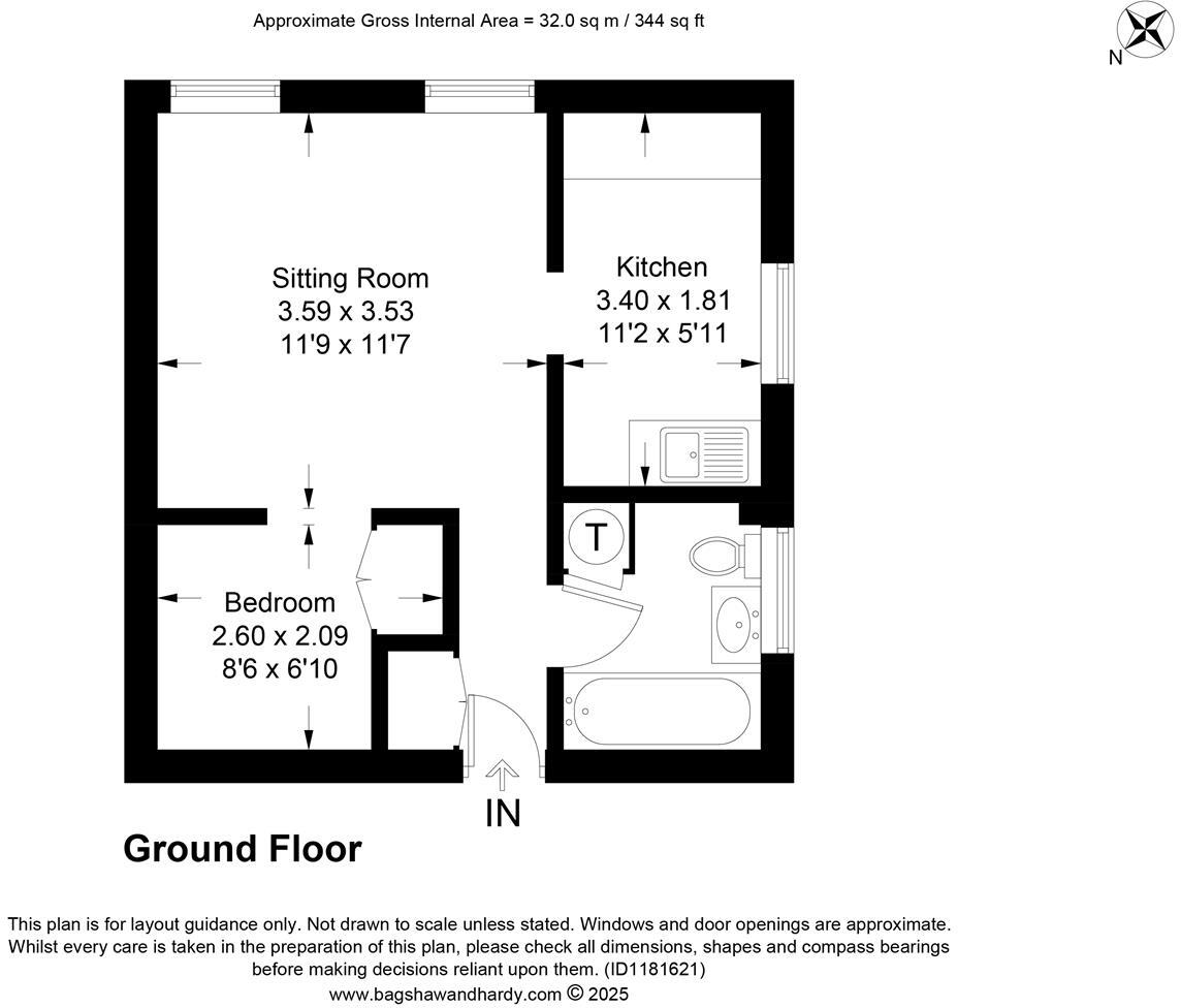 A ground floor studio flat featuring a good size sitting room opening into a bedroom area with built in wardrobes, good sized kitchen with appliances including an electric oven and hob, washing machine, fridge, freezer and room for small table and chairs. There is a bathroom with white suite an...