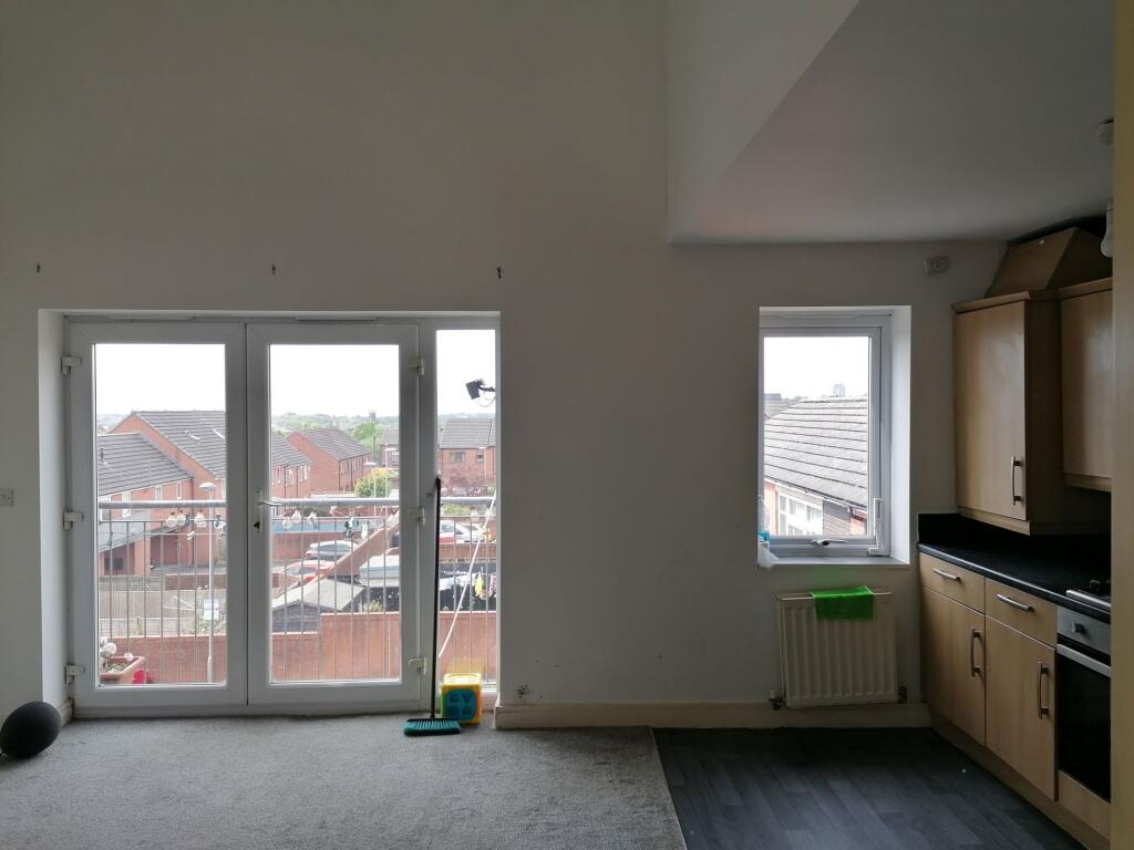 A two bedroom apartment located on the top floor of a purpose built apartment block in Derker. Consisting of an entrance hallway, two bedrooms (one double and one single), a bathroom with shower over bath, open plan lounge/kitchen with built in oven & gas hob with a balcony just off the lo...