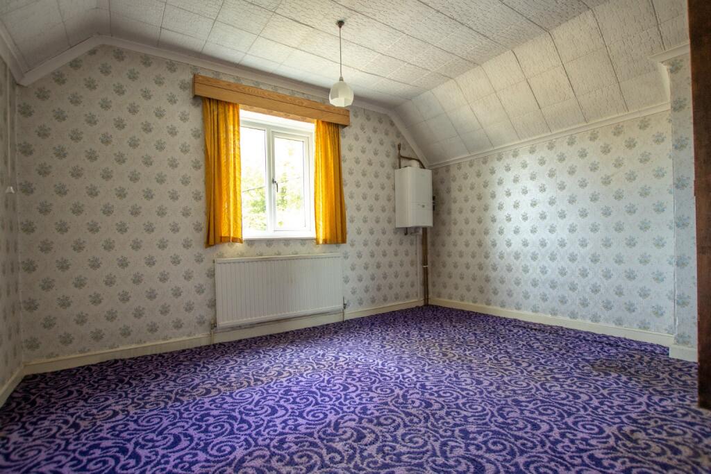The property itself is dated, requiring extensive modernisation and refurbishment. Outdated decor, carpets, and fittings are apparent in the photographs. A significant investment will be needed to bring the property to a contemporary standard, including potential structural repairs indicated by some of the wall damage.