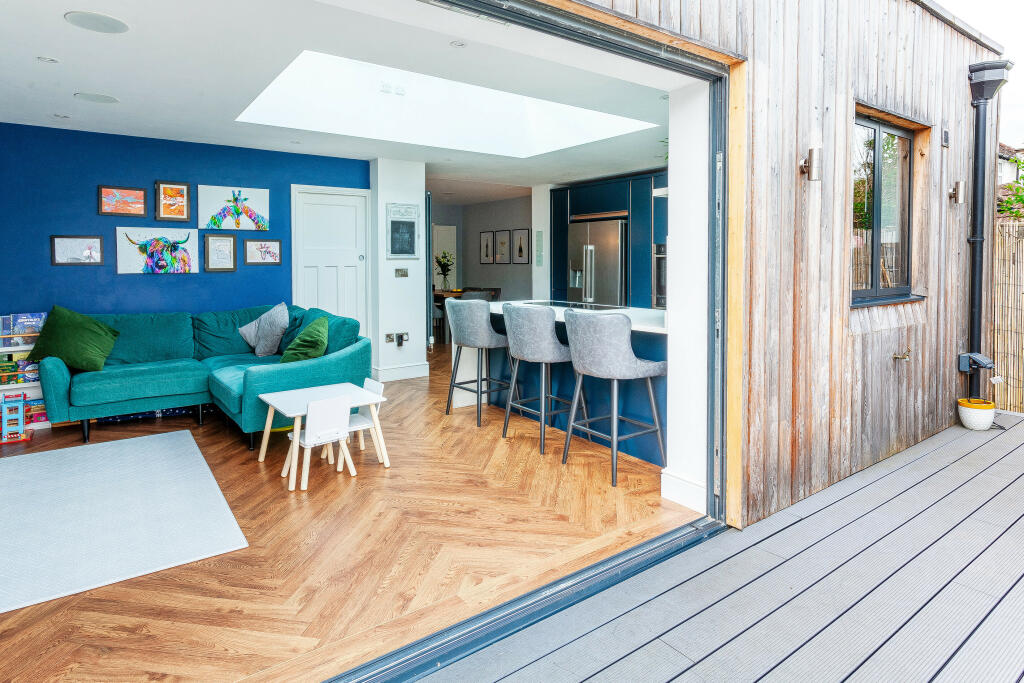 An immaculately presented four bedroom extended family home. This fabulous semi-detached property is arranged over three floors. There is a lovely modern kitchen and spacious open-plan family room and dining space. There is a large private rear walled garden laid to lawn with a decked terrace.