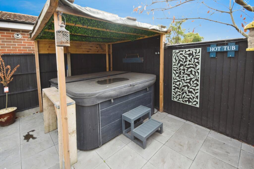 This is a detached property on Sea View Road in Winthorpe, Skegness. It features 6 bedrooms and 3 bathrooms. The house appears to be in good condition, with modern interior design. The property includes a paved garden with a hot tub and bar area. The location is near the coast and local amenities, with Skegness train station 1.23 KM away. The listing price is £325,000. The square footage is listed as 165.05, which seems incorrect given the size of the property.