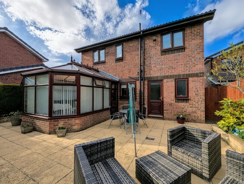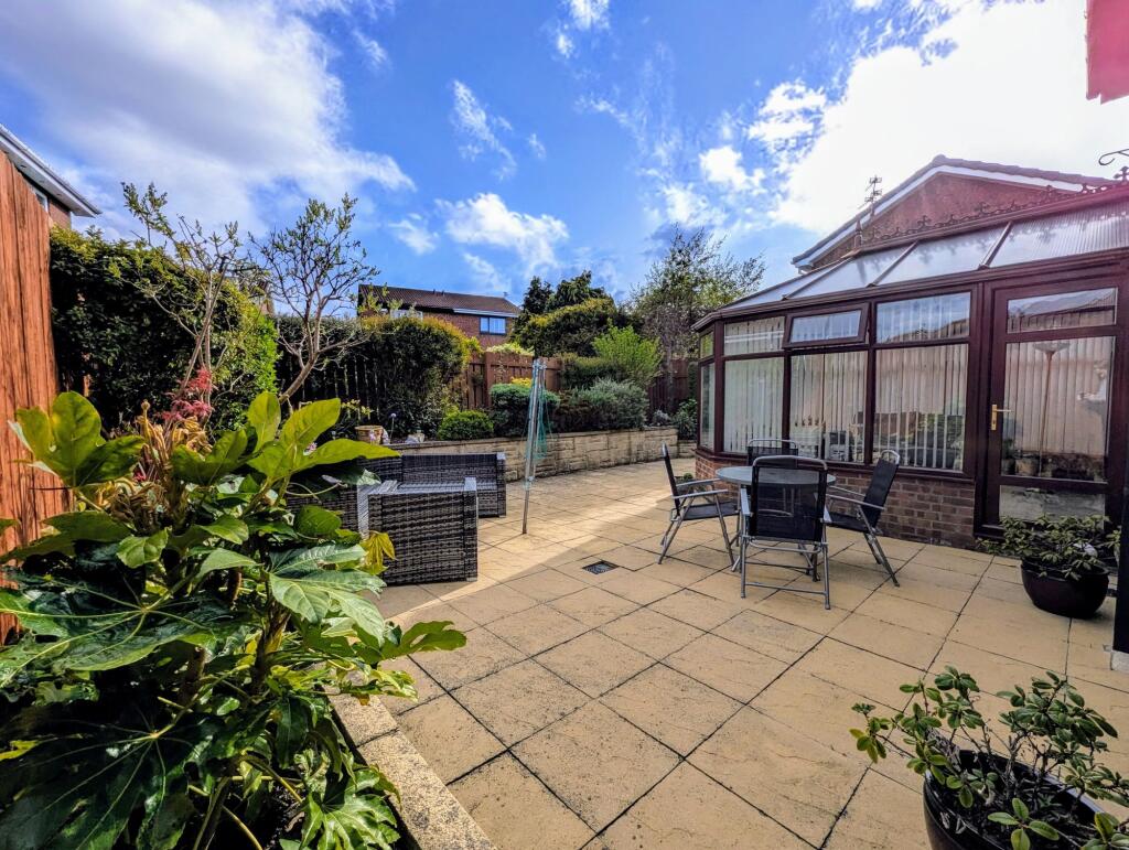 The property appears to be in good condition, with recently updated kitchen and bathroom fixtures. The images show a modern and well-maintained interior. The exterior also presents well, with a neat garden and paved patio area. The presence of a conservatory adds to the overall living space. There is also a garage.