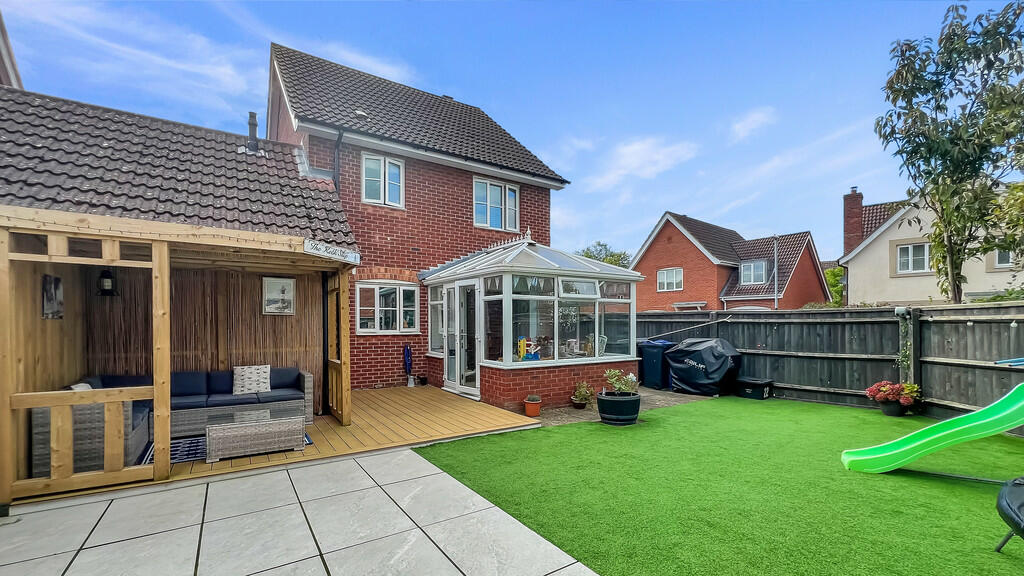 Externally, the property boasts a reasonably sized garden featuring artificial turf, patio areas, a pergola and other amenities. The garden space is thoughtfully designed, incorporating elements that enhance both functionality and aesthetic appeal. There is a small play area and ample space for outdoor furniture and other garden features. The inclusion of a wooden shed adds to the practicality of the garden.