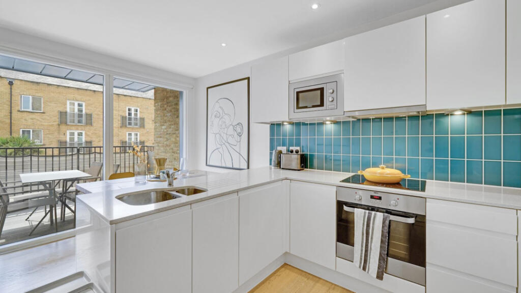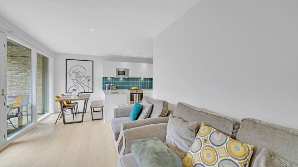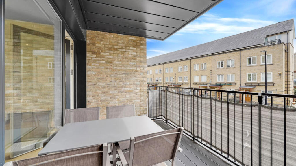 A modern two-bedroom flat in Island Gardens, Tower Hamlets. The property benefits from a balcony. The listing price is significantly below the average price per sqft for the area, suggesting good value.