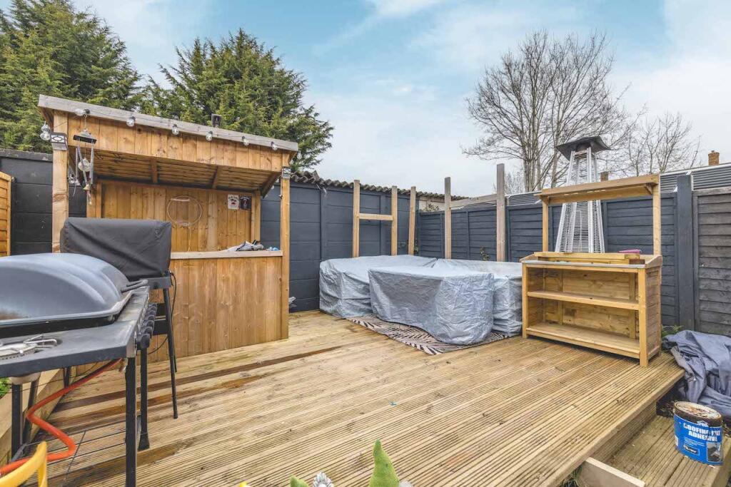 This three-bedroom terraced house in Slough, Berkshire is listed at £435,000. The property benefits from a modern kitchen and bathroom, and what appears to be a well-maintained garden with a decked area, hot tub, and shed. There are also multiple nearby schools and transport links. However, the average price per square foot in the area is significantly lower than the price per square foot of this property. It is important to note that the provided information on nearby properties does not include square footage, making a precise comparison difficult.