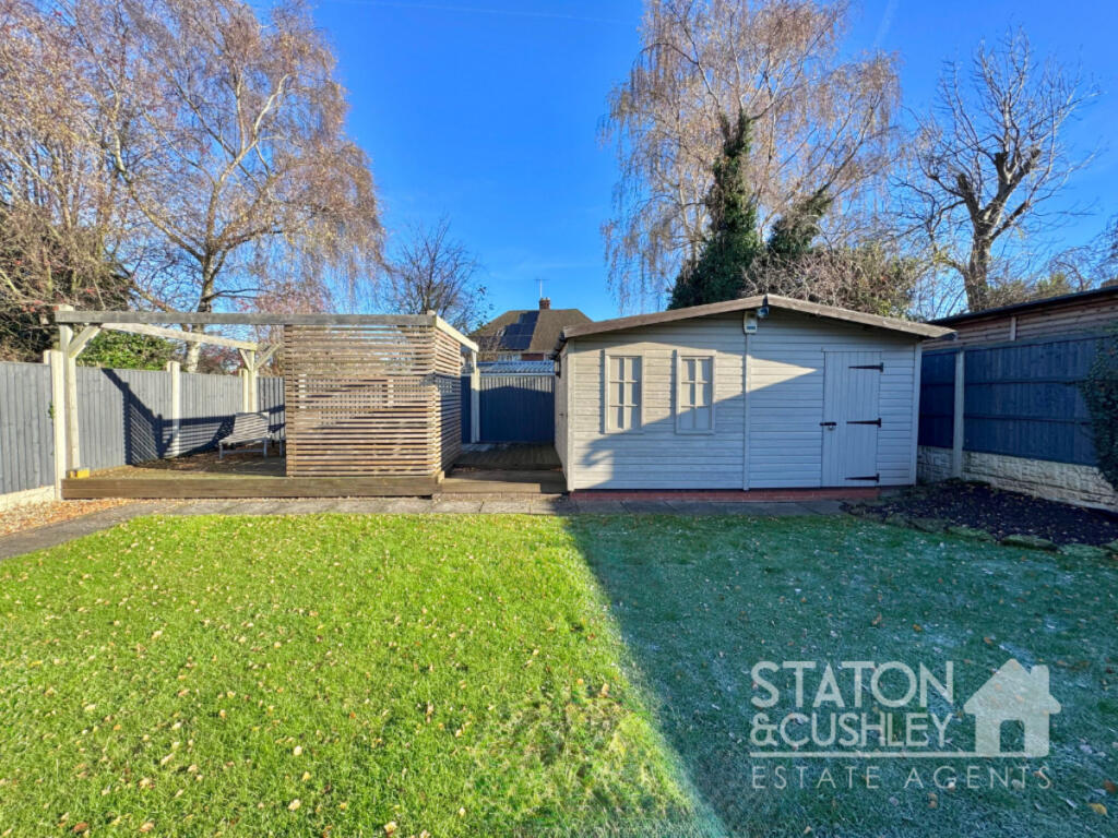 This is a detached property in Ladybrook, Mansfield. It features three bedrooms, one bathroom, and a square footage of 958.42. The property includes a well-maintained garden with a shed and patio. The interior appears to be modern, with updated bathroom and kitchen. The property is located close to schools and transportation, making it a desirable location. The price is slightly above the average for the area, but this is reflected in the condition of the property.