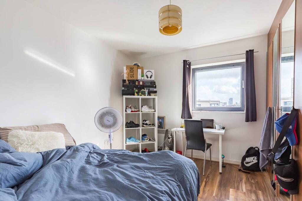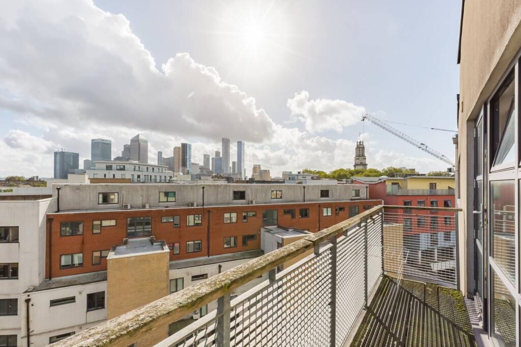 This contemporary 2-bedroom flat features a modern bathroom, ample storage, spacious double bedrooms and a large open-plan reception room/kitchen with fitted appliances, leading to a balcony with Canary Wharf views.