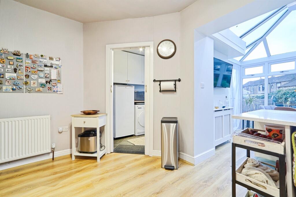 On Moorfield Crescent, this mid-terrace home features three bedrooms, a modern kitchen, bright conservatory, private driveway, and a lawned rear garden with decking.