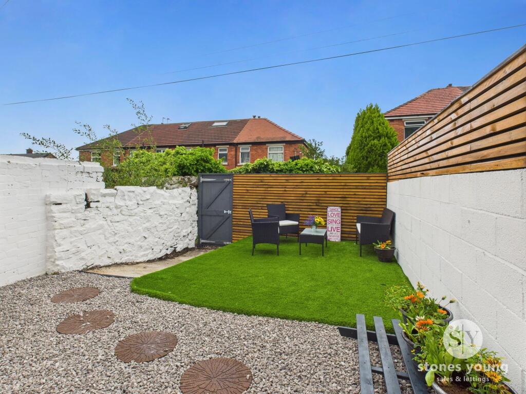 The property is a terraced house located on Wensley Road in Blackburn, Lancashire. It has 2 bedrooms and 1 bathroom. Nearby transportation includes Mill Hill (Lancs) train station, which is 1.24 KM away. There are several schools in the vicinity. The property appears to be in good condition based on the photos, with a modern kitchen and bathroom. The back garden is small and mainly paved with artificial grass. The listing price is significantly lower than the average price per square foot in the area.