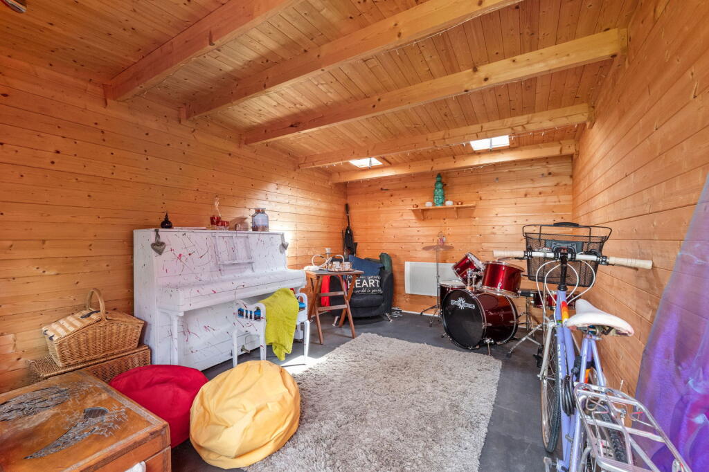 Based on the provided images, the property appears to be in good condition. The interior shows a modern kitchen and updated bathrooms. While some rooms have unique décor choices, there’s no visible evidence of significant disrepair or the need for extensive renovations. The property benefits from a well-maintained garden with a shed, offering additional outdoor space.