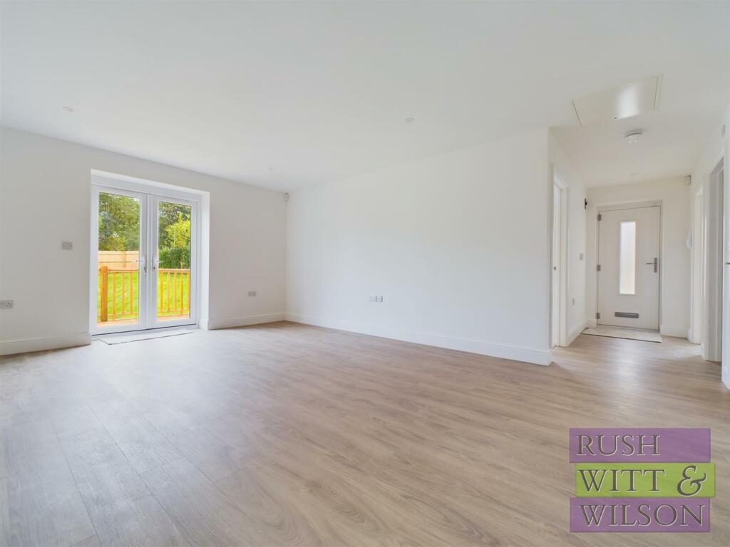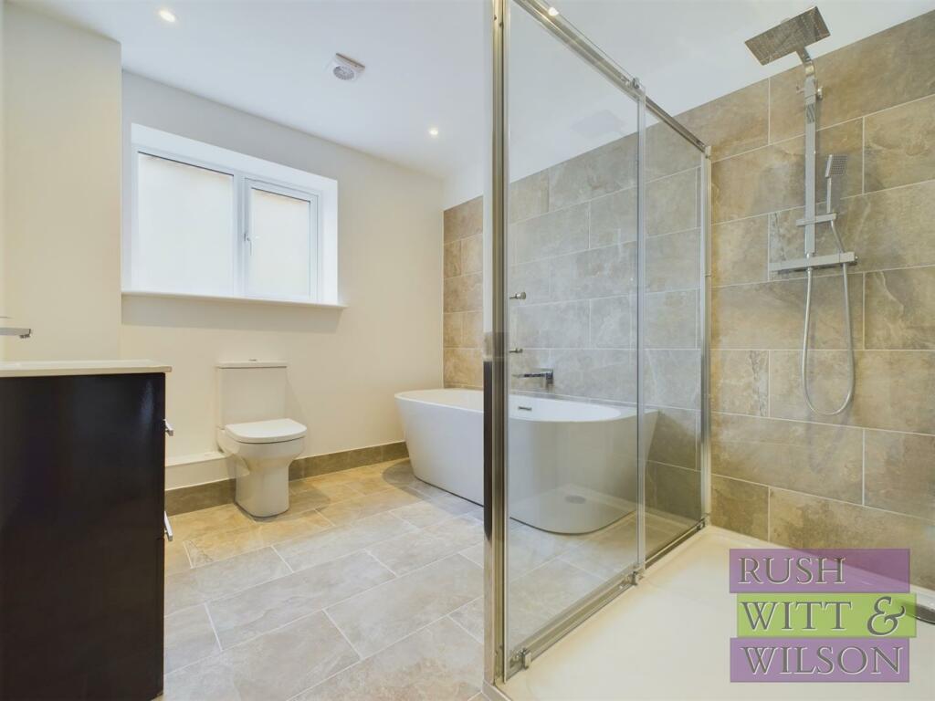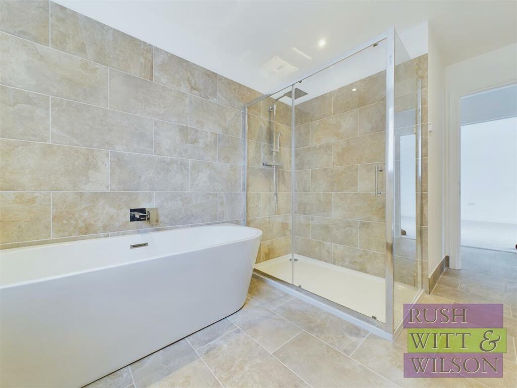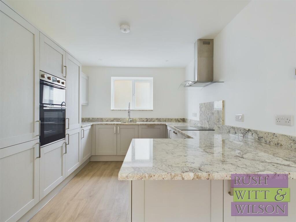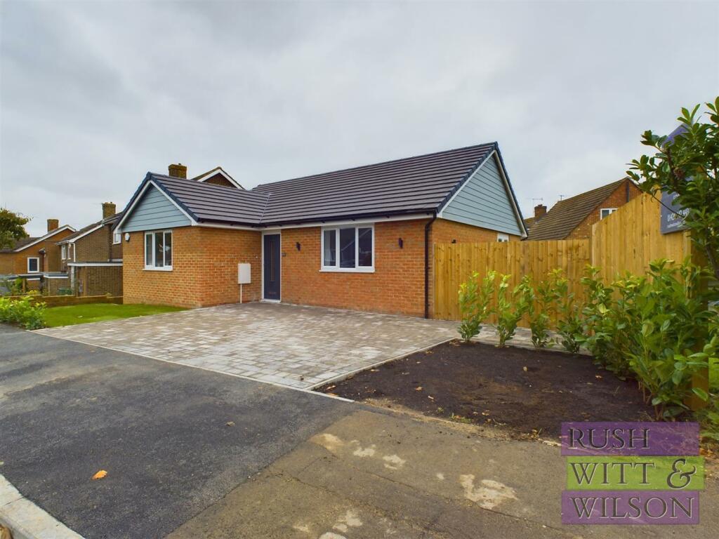 This property is a two-bedroom, one-bathroom bungalow located on Ghyllside Avenue in Conquest, Hastings, East Sussex. The property boasts a modern, newly renovated or built interior. The images showcase a contemporary kitchen with granite worktops, integrated appliances, and light-colored cabinetry. The bathroom is similarly modern, featuring a free-standing bath and a separate shower cubicle, all with quality-looking fixtures. The flooring consists of light-colored wood-style laminate in the living areas and carpeted bedrooms.