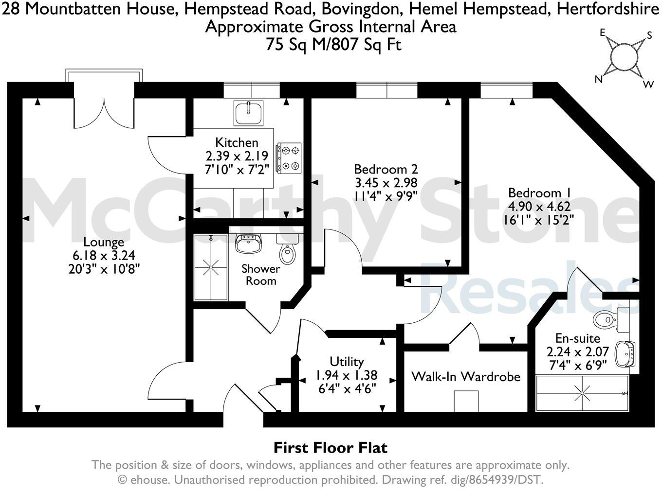 A bright and beautifully presented first floor retirement apartment with a south easterly aspect. Two double bedrooms, two shower rooms and a spacious living room opening to a juliet balcony. Mountbatten House, a McCarthy Stone retirement development in sought after Bovingdon.