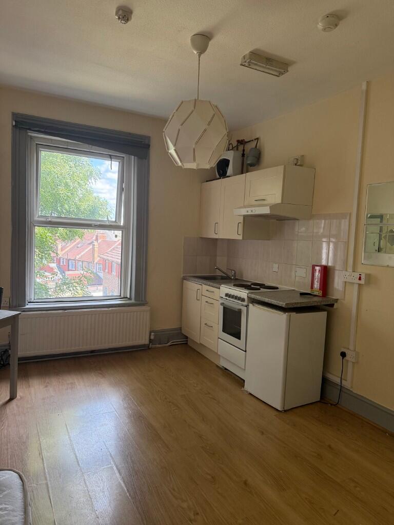 Bright bedsit with large window, wood-effect flooring, and compact kitchen area including oven, hob, and fridge. Neutral décor with grey trim, built-in storage, and single bed. Ideal for a single occupant seeking a simple, self-contained living space in a convenient location.