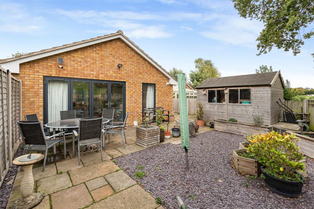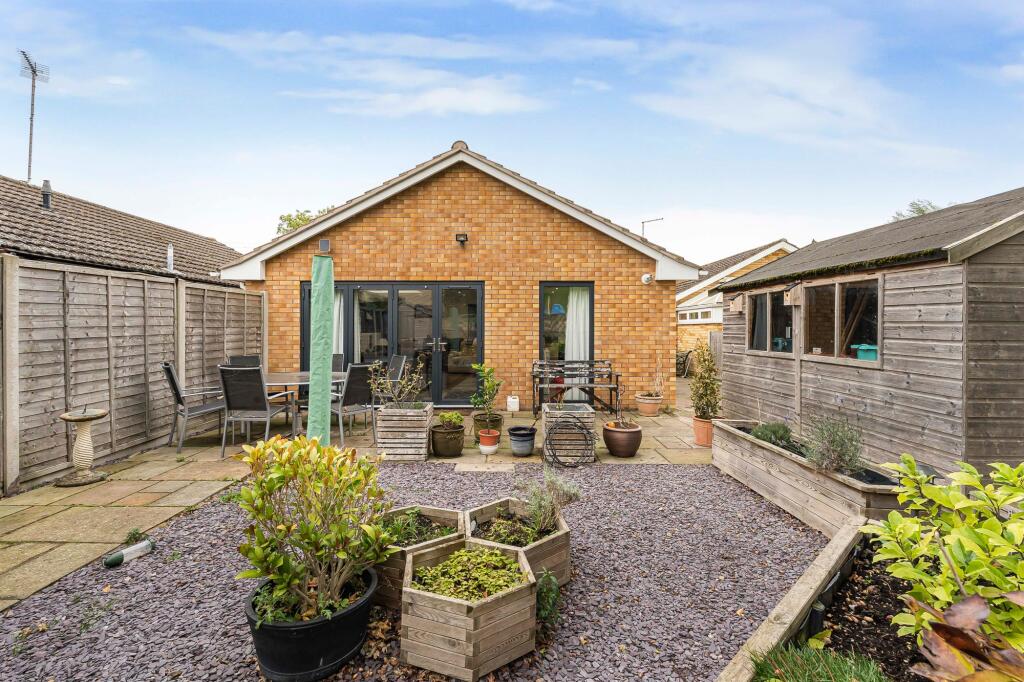 This is a detached bungalow located on Rockingham Road in Sawtry, Cambridgeshire. The property features two bedrooms and one bathroom, with a total square footage of 702.56. The property benefits from a modern kitchen and bathroom, and a well-maintained garden with a patio area and shed. Nearby schools include Sawtry Junior Academy, Sawtry Infants’ School, and Sawtry Village Academy. The listing price is £315,000.