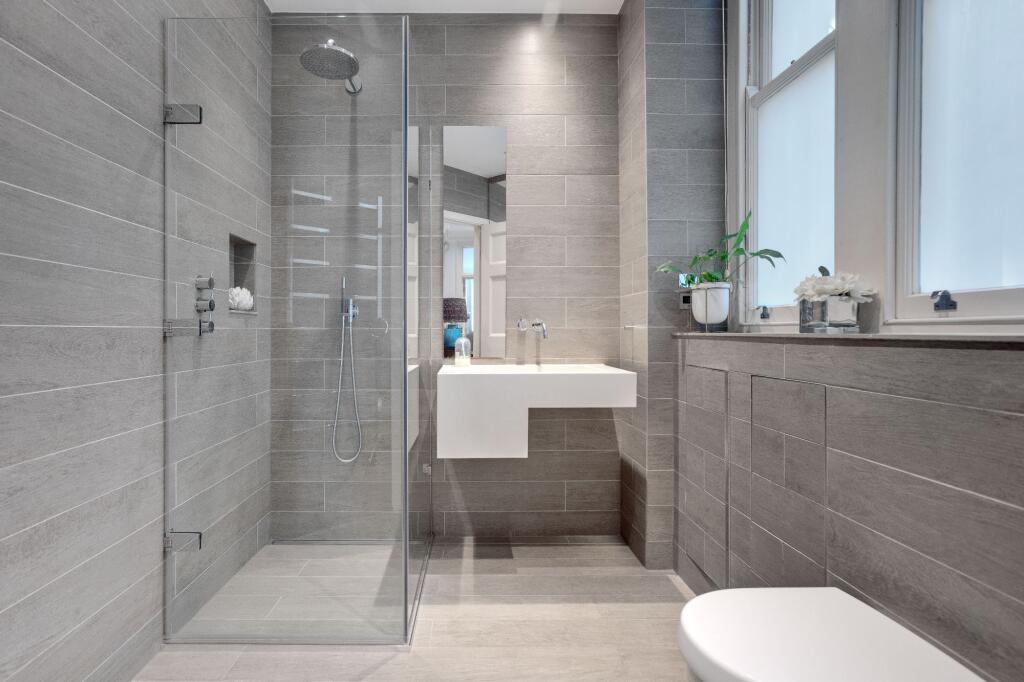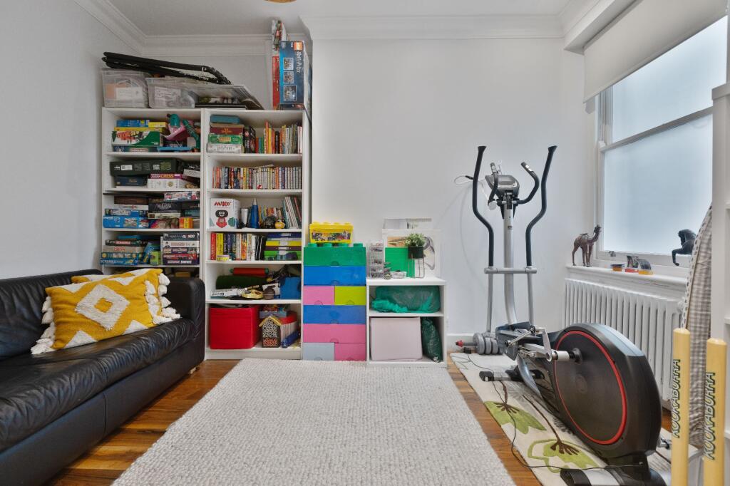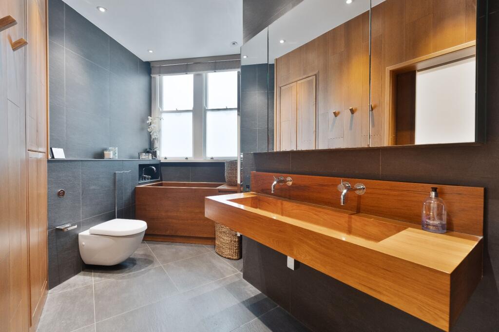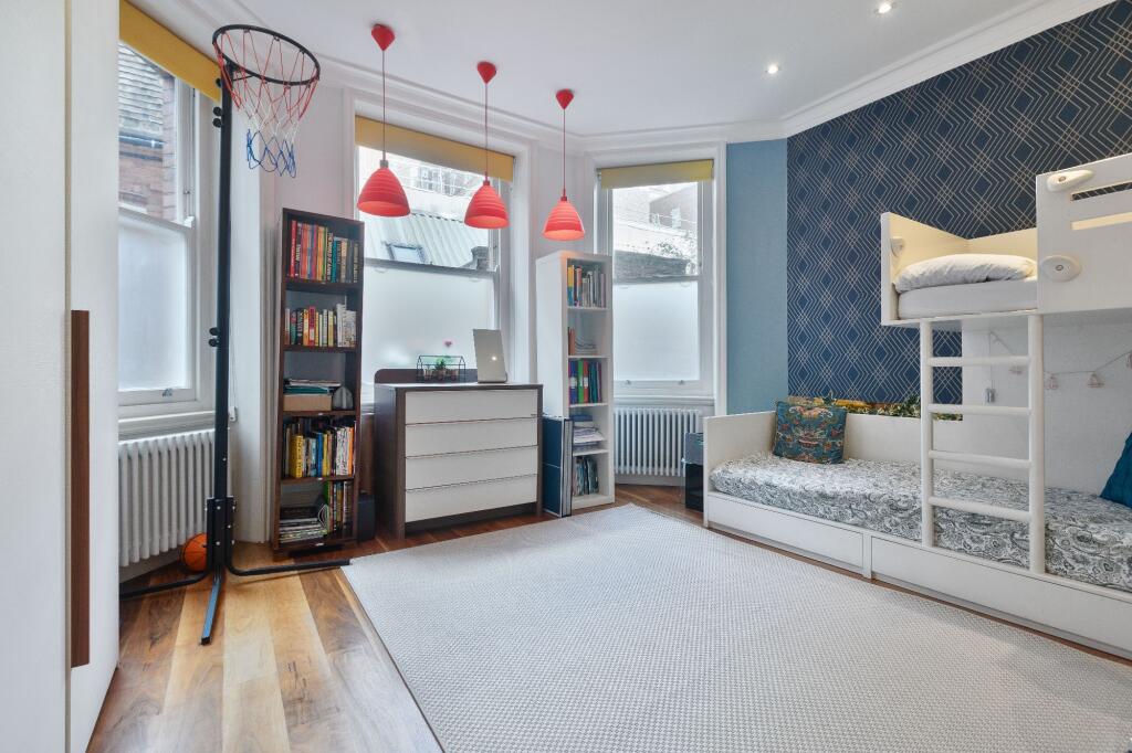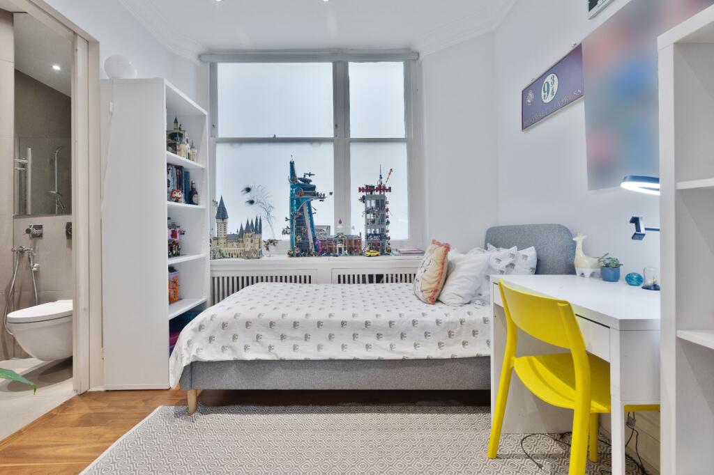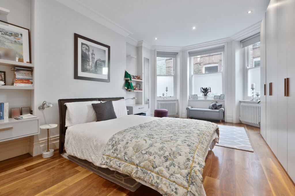 This spacious and bright family apartment has high ceilings with original decorative ceiling cornicing and solid walnut wood flooring throughout