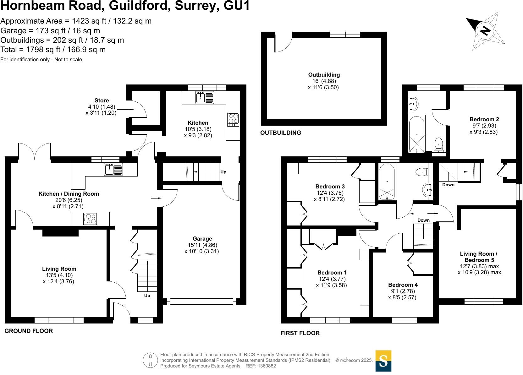 This is a semi-detached property located on Hornbeam Road in Guildford. It features 5 bedrooms and 2 bathrooms, with a total square footage of 1,798 sqft and a plot size of 1,423 sqft. The property appears to be in good condition, with modern interior finishes. It includes a garden with a patio area. The location is convenient, with several schools and transportation options nearby. The list price is £625,000, which is slightly above the average price per square foot for the area, but reflects the size and features of the property. The property also benefits from off street parking and a utility room.