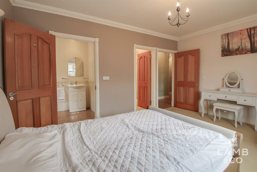 This is a well-presented, three-bedroom detached bungalow located in a non-estate area. It features a south-facing rear garden, a main bedroom with an en-suite and dressing room, and a conservatory. The property is offered with no onward chain.