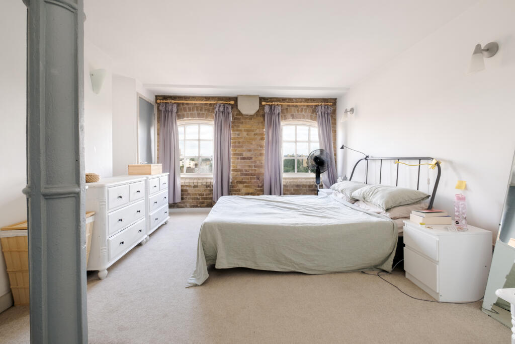This two-bedroom apartment at 6 Deal Street, Spitalfields, is a stylish warehouse conversion situated on the fifth and sixth floors. The property benefits from a spacious, light-filled interior with large windows offering impressive views across the city. Features include exposed brickwork, wooden floors, and a modern, though modestly sized, fitted kitchen. The apartment is part of a building with allocated parking and offers access to a communal roof terrace with city views.