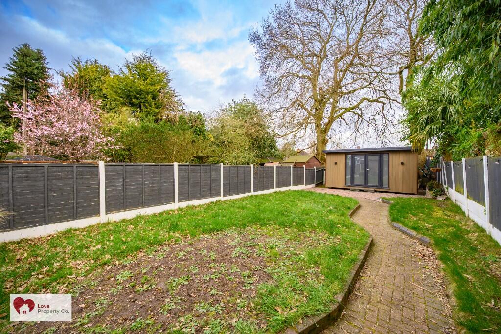 The property is a 4 bedroom, 2 bathroom semi-detached house located on Clinton Road in Shirley, Solihull. It has a list price of £475,000 and a plot size of 1,479 sqft. The property is presented in excellent condition and has undergone a significant modernisation. The images show a modern kitchen and extension to the rear. The property also benefits from a well-maintained garden with a substantial garden shed/summer house.