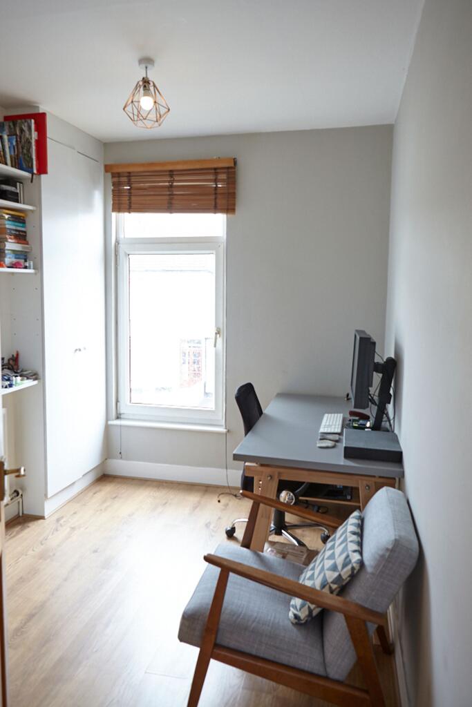 A remarkable 2-bed flat flooded with natural light. Modern kitchen, elegant walk-in shower, bay windows, built-in storage, private terrace, garden. Blend of modern comfort and timeless charm. Contact us today to view.