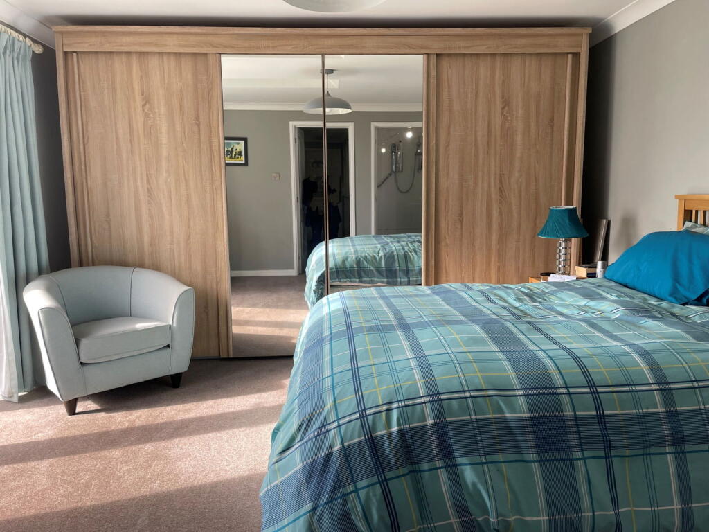 A superb, detached reverse-level house with driveway, garage, gardens, far-reaching views, 4 bedrooms, 2 bathrooms (1 en-suite), study, lounge & kitchen/diner.