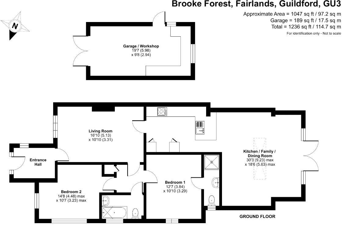 This is a two-bedroom bungalow located in Brooke Forest, Fairlands, Guildford. The property is in generally good condition, with a modern kitchen and bathroom. It features a good-sized garden with a shed and patio area. The property is located close to local schools and amenities. The property is listed for £489,950, which is below the average price for properties in the area.