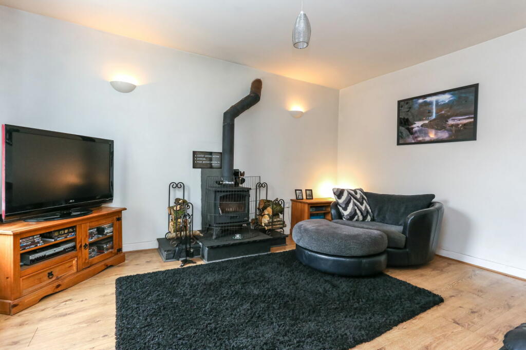 Based on the provided images, the property appears to be in good condition. The interior is presented well, with modern fixtures and fittings in the kitchen and bathroom. There is evidence of a recently installed wood burning stove. The property benefits from a substantial garden, which is well-maintained and includes a shed.