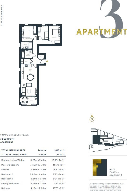 Large 94 sq m, first floor three-bedroom apartment with private balcony, within the Clapham Quarter development in Clapham.