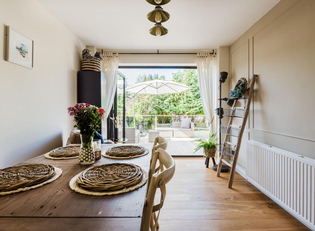 This four-bedroom detached house on Amberley Road, Macclesfield, presents a compelling proposition for prospective buyers. Situated in a desirable residential area of Macclesfield West And Ivy, it benefits from excellent proximity to well-regarded schools, including several with ‘Good’ and ‘Outstanding’ Ofsted ratings. The images reveal a contemporary interior, tastefully renovated with a modern aesthetic. Features appear high-end, including what looks like an AGA-style range cooker in the kitchen. The property benefits from a significant amount of outdoor living space including a well-maintained lawn and decked area, ideal for entertaining or family leisure.