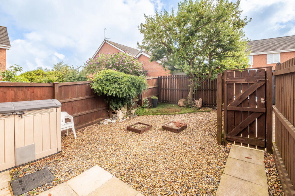The property includes a relatively small, enclosed rear garden. While not expansive, it offers a private outdoor space suitable for relaxation or entertaining. The garden is mainly gravelled, with some planted areas.