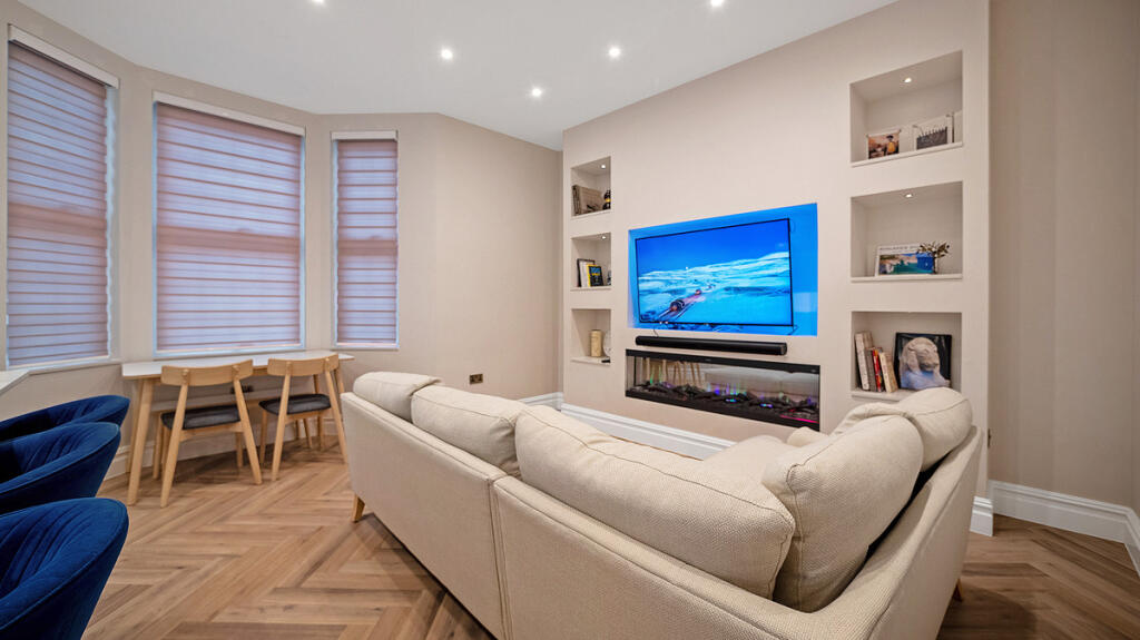 This modern home boasts a fully integrated smart automation system with Alexa-controlled lighting, electric blinds, and a Lightwave smart lighting system, complemented by a Sonos sound bar, ceiling speakers, and smart features
