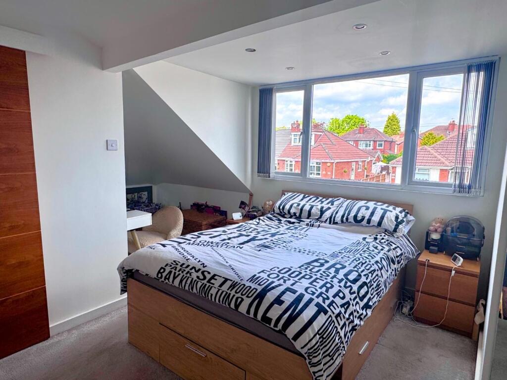 This property is a 3 bedroom, 2 bathroom semi-detached bungalow located in New Moston, Manchester. The property has undergone a significant extension and modernisation, as evidenced by the images. The extension appears to have added a substantial amount of living space, including a large open-plan kitchen/living area and a new master bedroom suite with en-suite. There is also a good-sized garden with decking and a garden room/office.