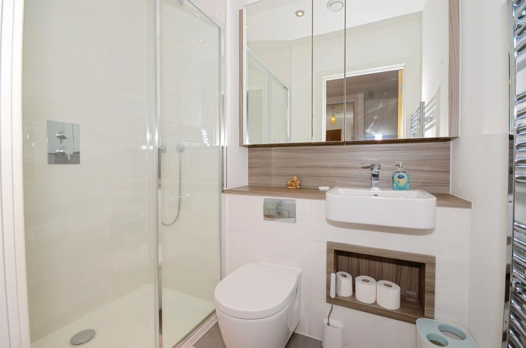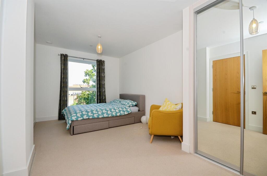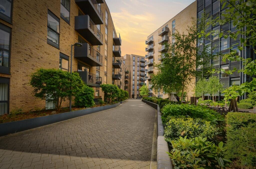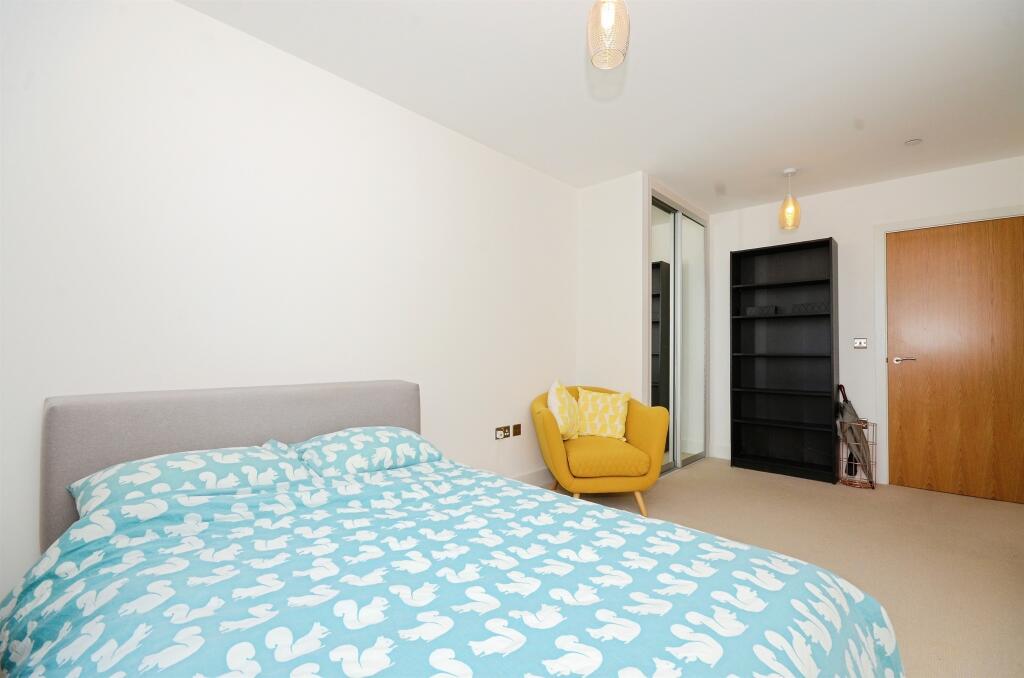 This modern flat features a spacious open-plan living area with a sleek fitted kitchen and integrated appliances, leading to a private balcony. Two double bedrooms and a family bathroom. The property benefits from a communal gym, and concierge service.