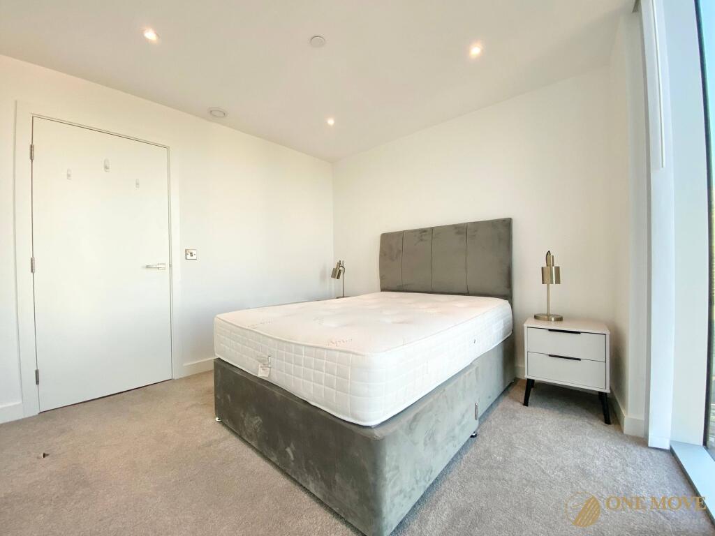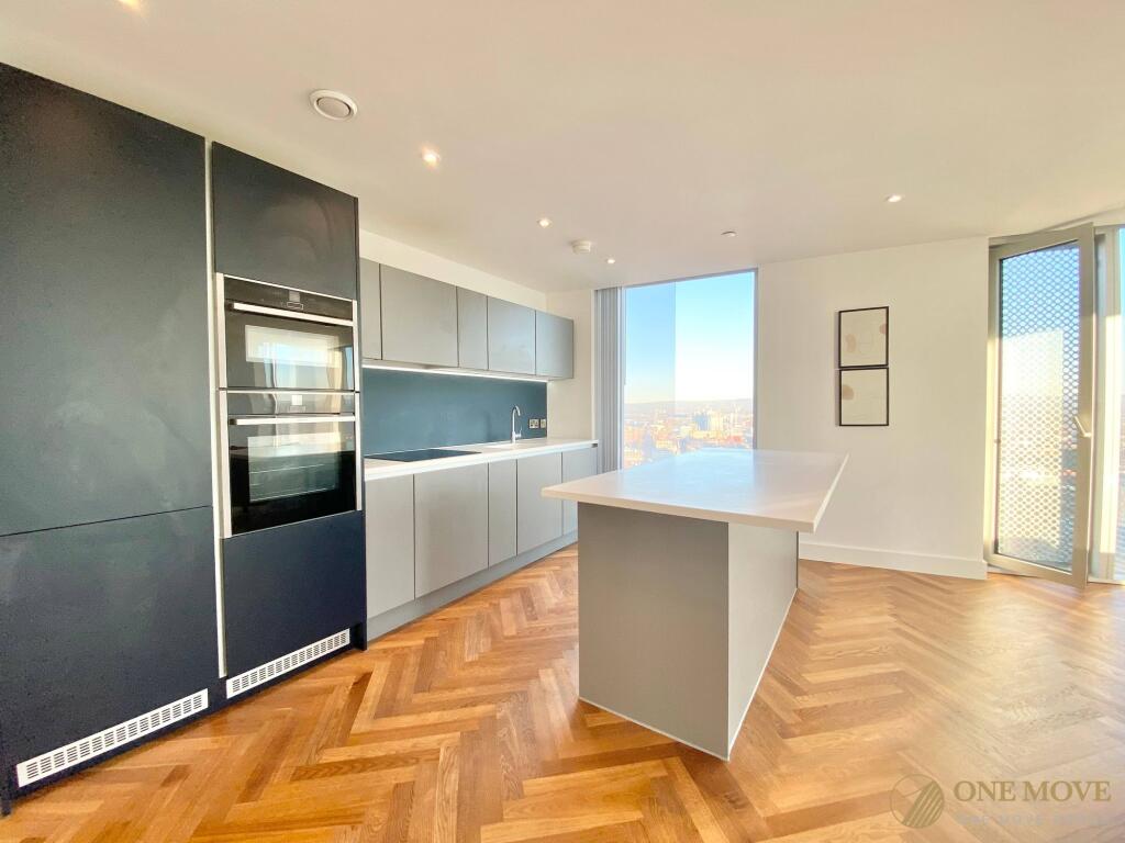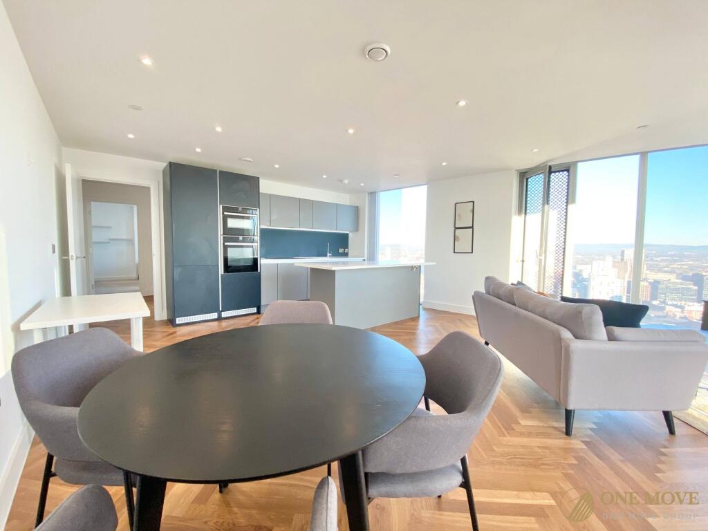 This 38th floor apartment comprises; an entrance hallway, spacious living room with a corner aspect, open plan to the bespoke kitchen units featuring integrated appliances, including hob, oven, fridge-freezer, dishwasher and wine cooler.