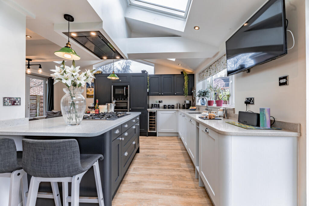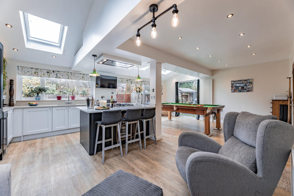 The property itself is a detached house that appears to be in excellent condition. The images show a recently renovated, modern interior with a high-quality finish. The kitchen extension is a particularly impressive feature, adding significant value to the property. The exterior is well-maintained, and the garden is a good size, offering ample outdoor space.