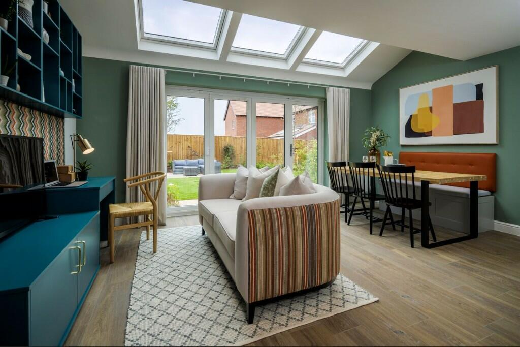 This property is a four-bedroom house located in the Alconbury Weald development in Huntingdonshire, Cambridgeshire. It is a new build home that appears to be in excellent condition. The interior boasts modern fixtures, fittings, and a high standard of finish. The open-plan living space flows well from the kitchen to the dining and living areas, with bi-fold doors opening onto a rear garden. The property’s modern design and seemingly high-quality construction are evident in the photographs. There are four bedrooms and an en-suite bathroom. The kitchen includes modern units and appliances.