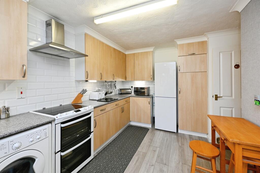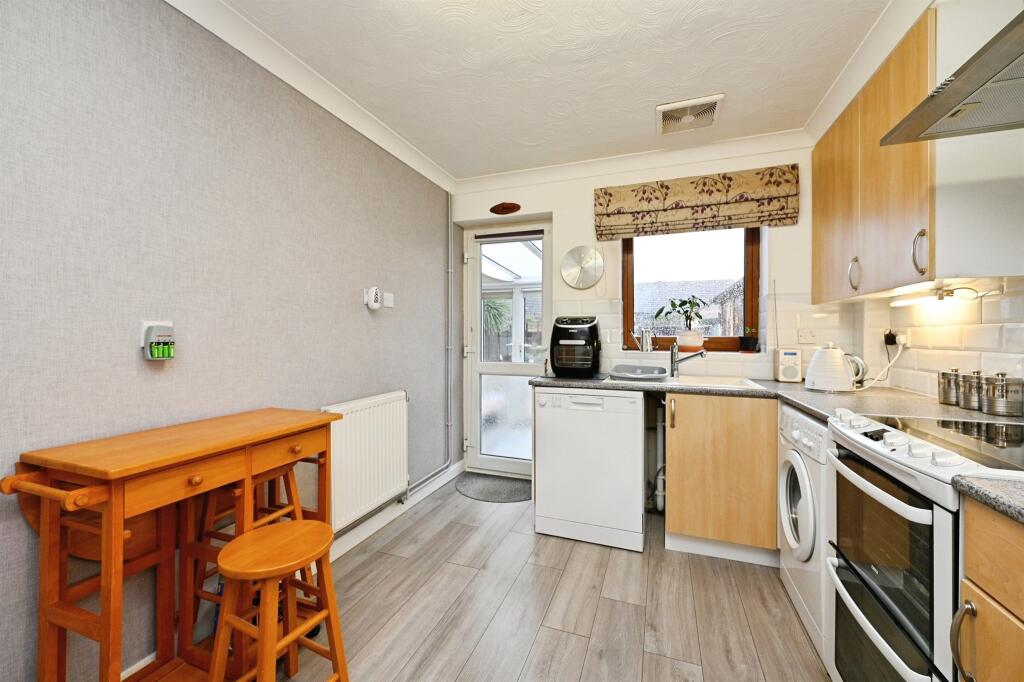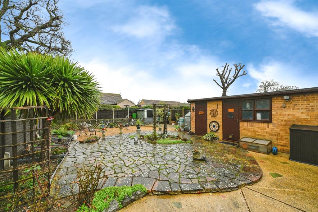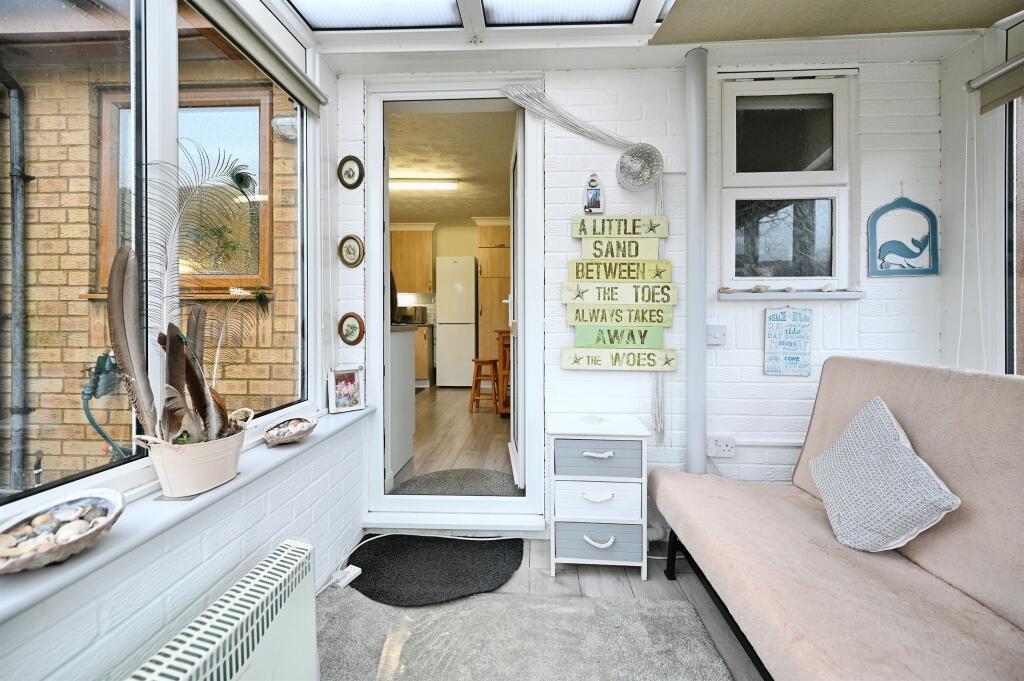This is a semi-detached bungalow in Heacham. The property has one bedroom and one bathroom. It features a modern kitchen and bathroom, a conservatory, and a garden. The garden is mostly paved and gravelled. The property is located near schools and the coast. The listing price is £280,000.