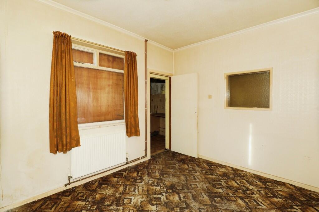 The property located on Bond Street, Northwich is a three-bedroom semi-detached house with a list price of £160,000. The property is in need of significant renovation, as evidenced by the provided images. The interior features outdated fixtures, worn carpets and damaged walls and ceilings. The exterior also shows signs of disrepair. The garden is present but requires considerable attention.