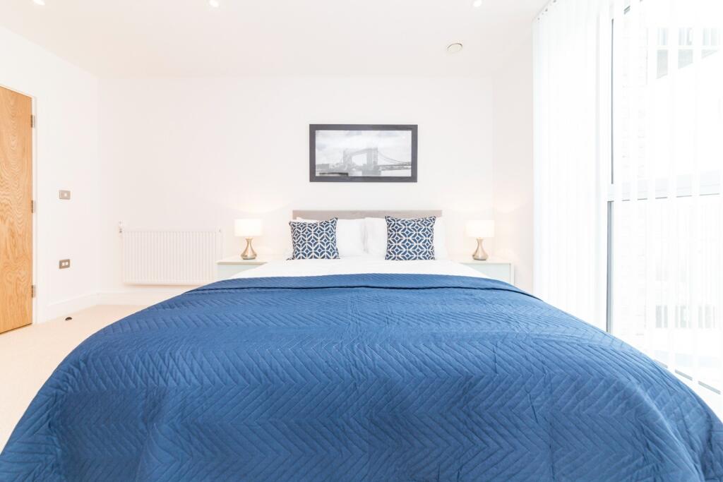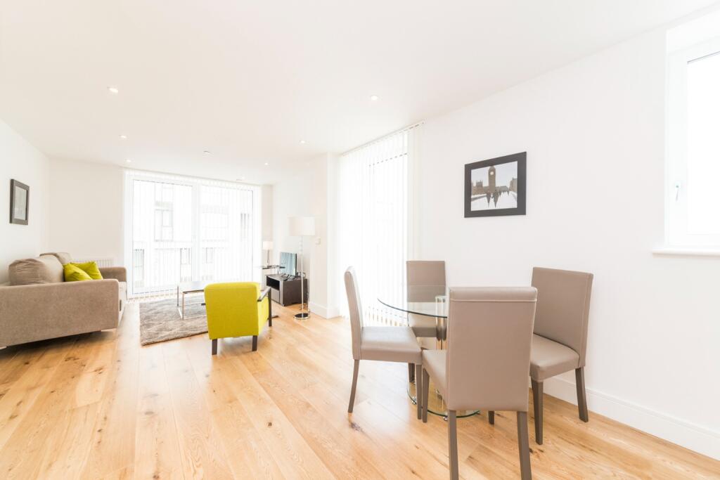 Discover this contemporary two-bedroom, two-bathroom apartment in Greater London, featuring an open-plan living area, 24-hour concierge, and a roof garden, ideally located for transport links.