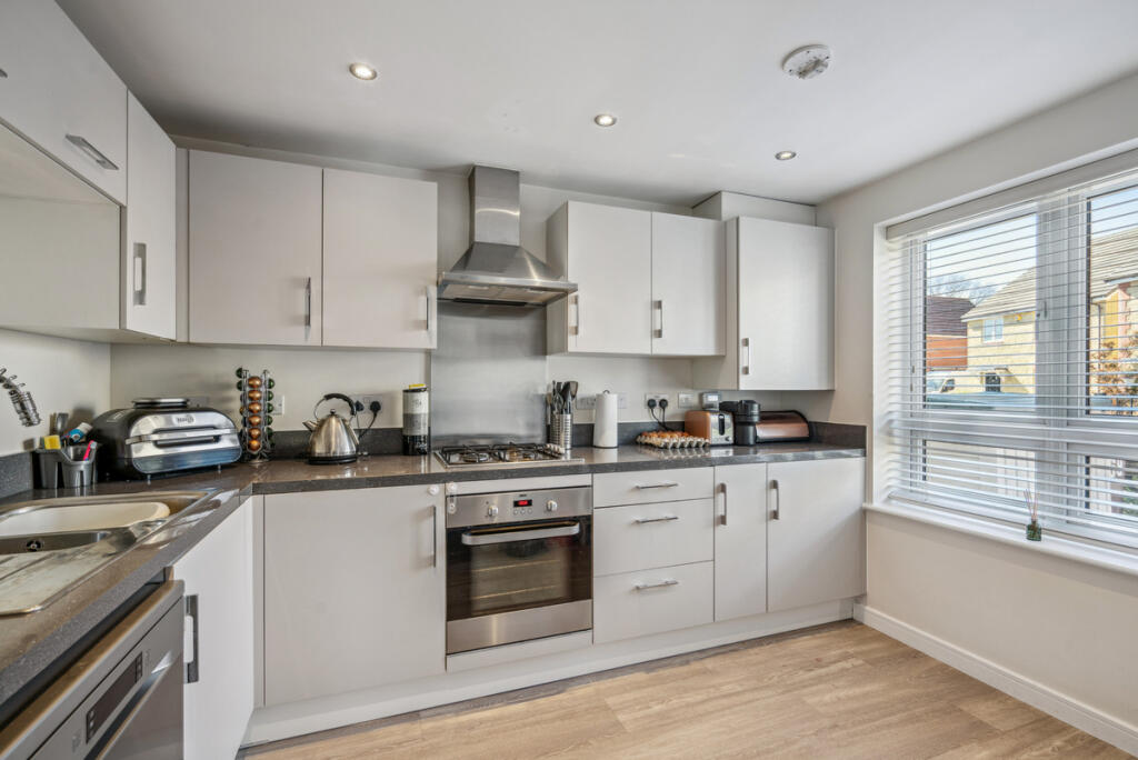 Based on the provided images, the property appears to be in excellent condition. It is modern in style and well-maintained, with a contemporary kitchen and bathroom. There is no visible evidence of wear and tear or the need for renovation. The property also benefits from a garage and a well-maintained garden.