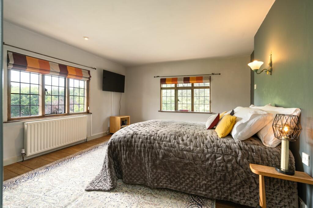 This property located on Hogscross Lane, Chipstead, offers a blend of period charm and modern comforts. The images showcase a beautifully maintained home featuring exposed brickwork, traditional wooden beams, and updated interiors with a well-equipped kitchen and modern bathrooms. The exterior is equally appealing, with well-tended gardens and mature trees adding to the property’s curb appeal.