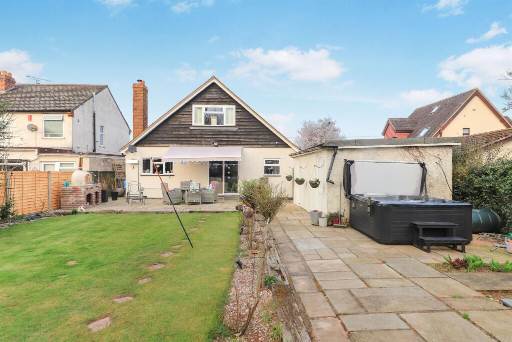 This property is a 4-bedroom detached bungalow located in Codsall, South Staffordshire. The location benefits from being close to several primary and secondary schools, including Birches First School (0.45km), St Christophers Catholic Primary Academy (0.75km), and Codsall Community High School (0.85km), all with good Ofsted ratings. Transport links are also convenient, with Bilbrook train station just 0.55km away. The property itself appears to be in excellent condition, having undergone recent renovations or modernisation as evidenced by the modern kitchen and bathrooms shown in the photos. The images reveal a well-maintained garden with a patio area, hot tub, and a separate garden shed/office. The list price of £499,950 is slightly below the average price of £517,259 for the area, but significantly higher than other nearby properties. However, considering the property’s condition, size, and features, the price may be justified. The lack of plot size information makes a definitive statement on land value difficult.