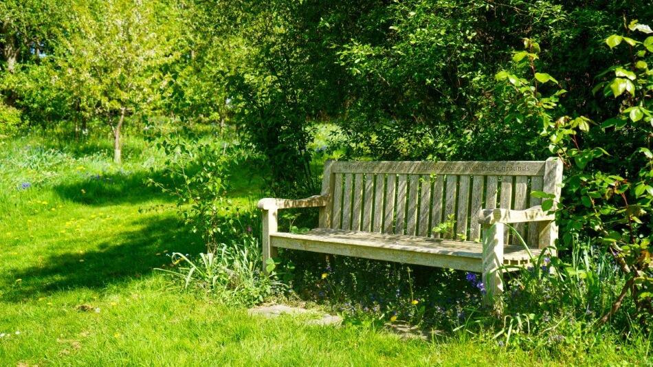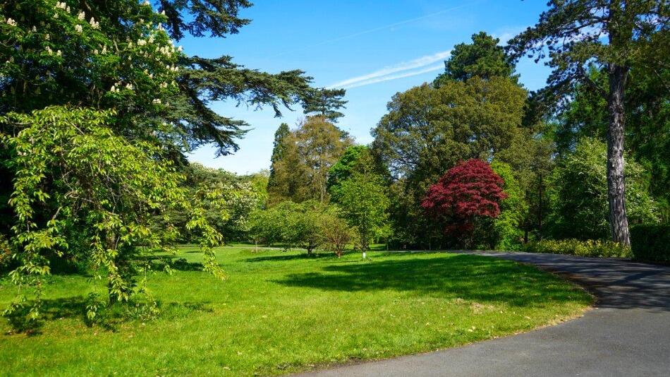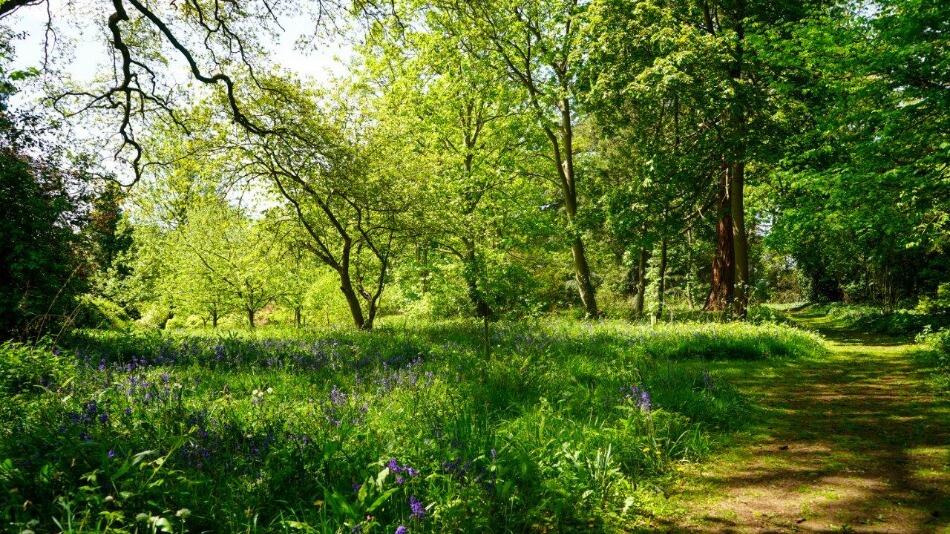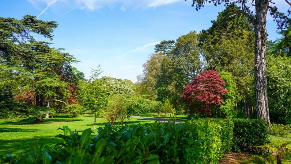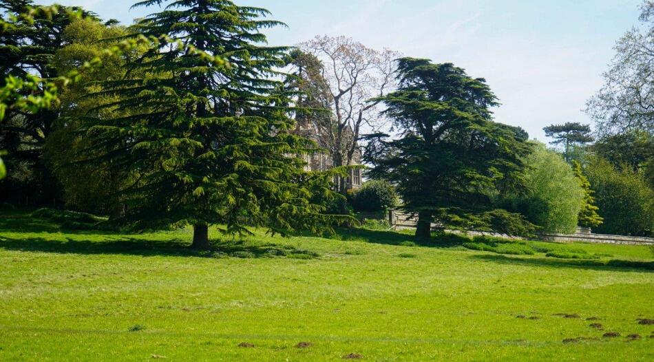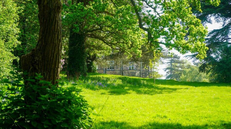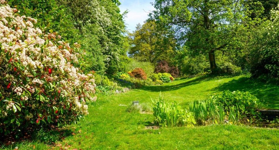 The property boasts a substantial amount of land, including a well-manicured garden, mature trees, and a pond.