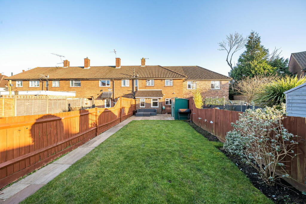 Based on the photos, the property appears to be in good condition. The interior is modern and well-maintained, with updated kitchen and bathrooms. There is no visible evidence of significant repairs or renovations needed. The garden is also well-maintained and of a reasonable size.