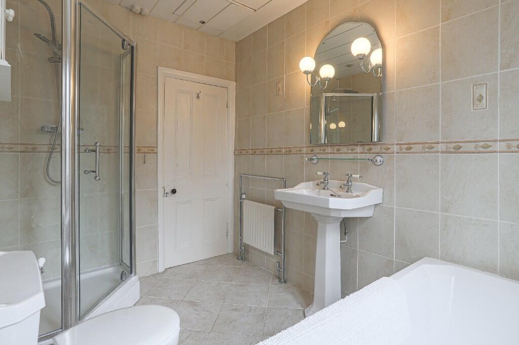 The property itself appears to be well-maintained and in good condition. The interior is presented to a high standard, with modern fixtures and fittings. The kitchen and bathrooms appear updated and clean. The property has retained some of its traditional character, evidenced by architectural features visible in the images.