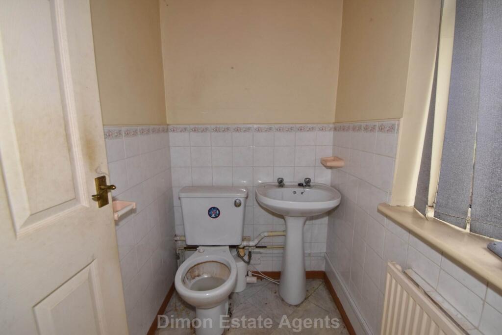 In need of updating and repair. A 2 bed end terraced house with a twin aspect lounge, spacious kitchen and conservatory. The bathroom is located on the 1st floor. Garage to rear.