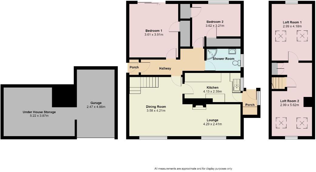 CHAIN FREE! A good sized 2 bedroom detached bungalow that benefits from a driveway, garage, large under house storage, lounge/diner, kitchen, 2 double bedrooms, shower room, 2 loft rooms and enclosed rear garden.
