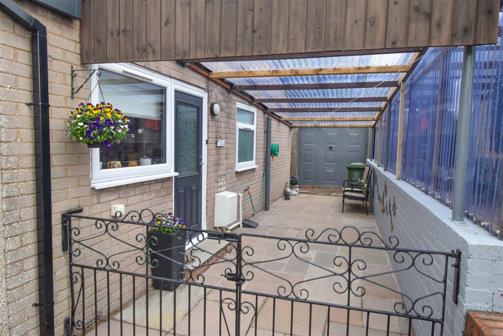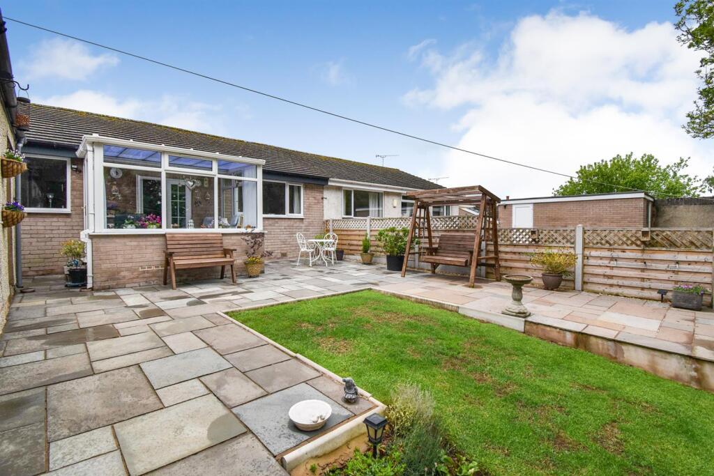 The bungalow has a garden with a paved patio area and a small lawn.