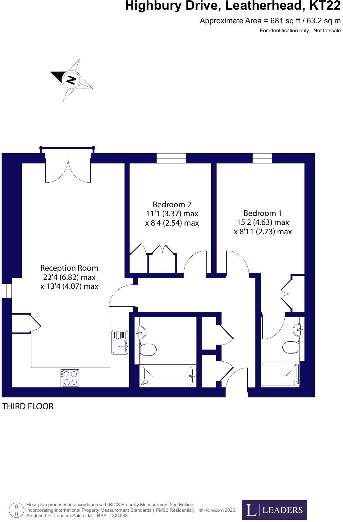 This is a two-bedroom apartment located on Highbury Drive in Leatherhead, Surrey. The property is listed for £325,000. It features two bathrooms. Leatherhead railway station is within walking distance. Several schools are located nearby, including Therfield School. The apartment appears to be in good condition, with modern fixtures and fittings. The listed square footage of 249.25 sqft seems incorrect and should be verified. The apartment has no garden. The price seems reasonable for the area, assuming the square footage is incorrect.