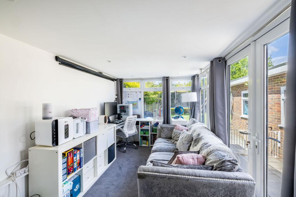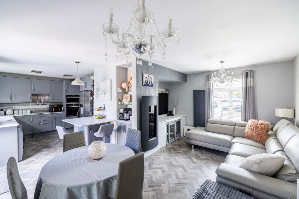Guide price £375,000-£395,000. Immaculate 3-bed family home with contemporary design, open-plan living, sun room, low-maintenance garden, and outbuilding. Generous driveway, convenient location near parks and schools.
